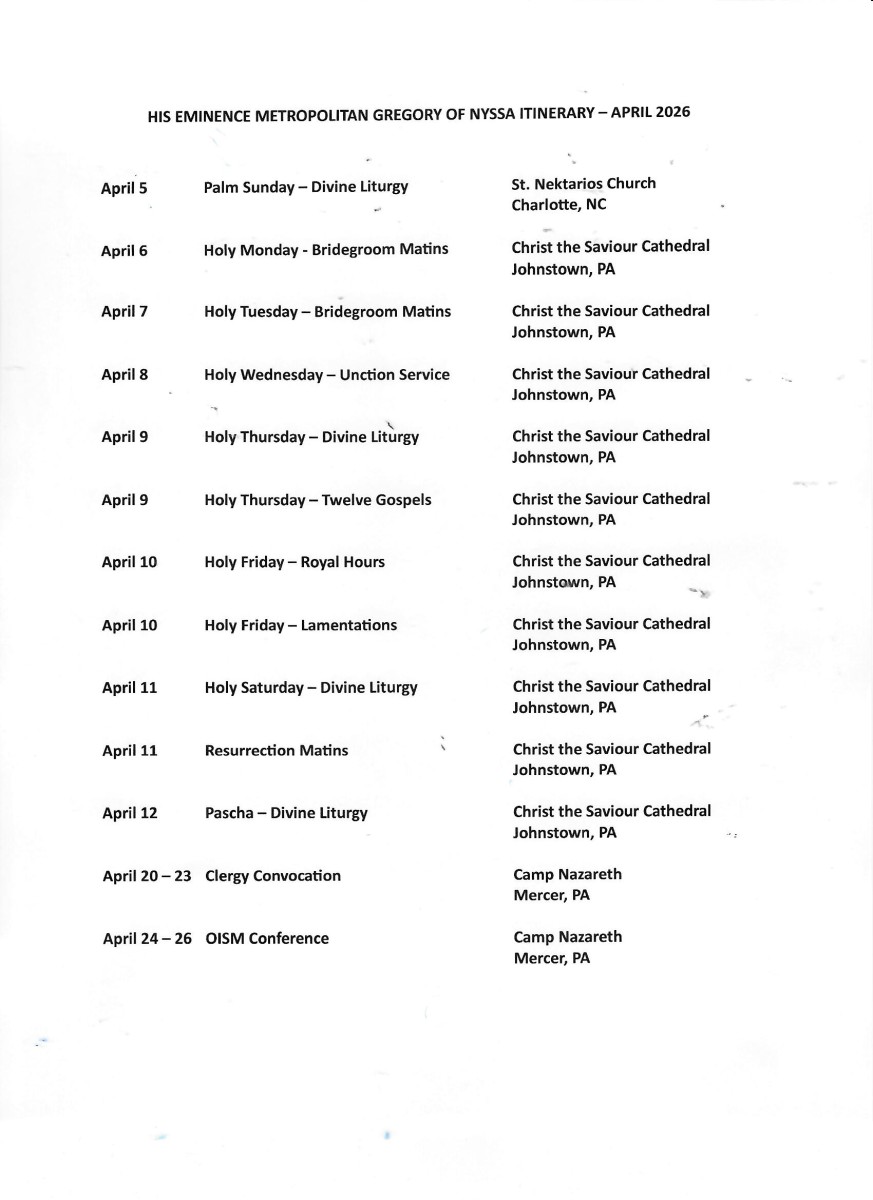 JOHNSTOWN, PA -- [Diocesan Chancery] The schedule of His Eminence, Metropolitan Gregory of Nyssa for April 2026 has been released by the Diocesan Chancery: