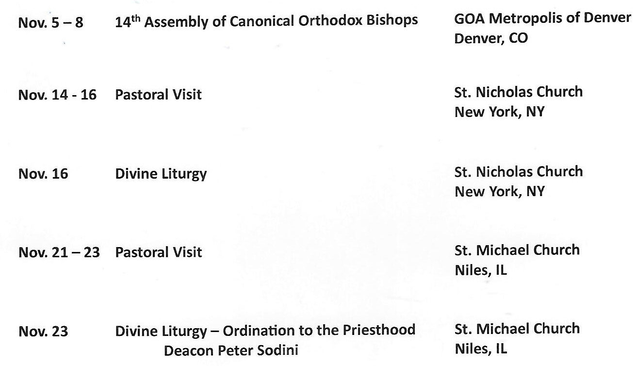 Schedule of His Eminence, Metropolitan Gregory For November 2025